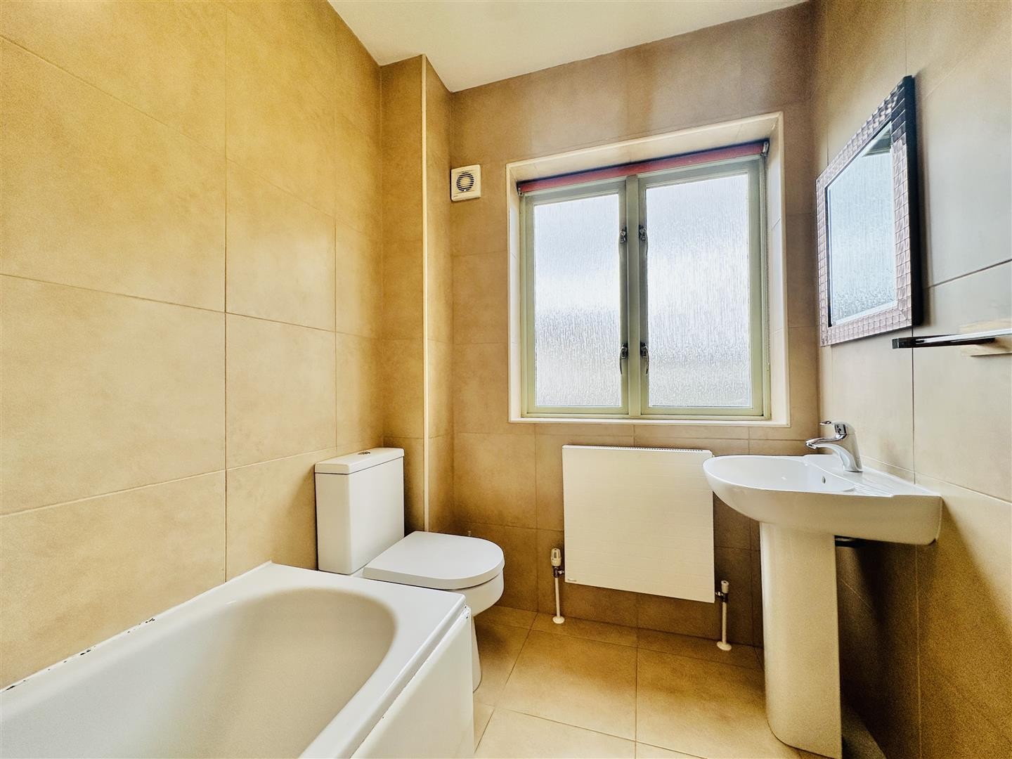 Finished with tiled flooring and tiled walls, panelled bath with mixer attachment, wash hand basin, toilet, radiator, and a double-glazed window facing the front aspect.