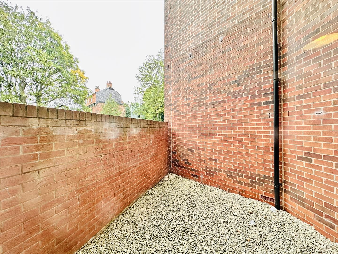Private outdoor space finished with a gravel surface, secluded by a brick-built perimeter, providing a low-maintenance and private setting for relaxation.
