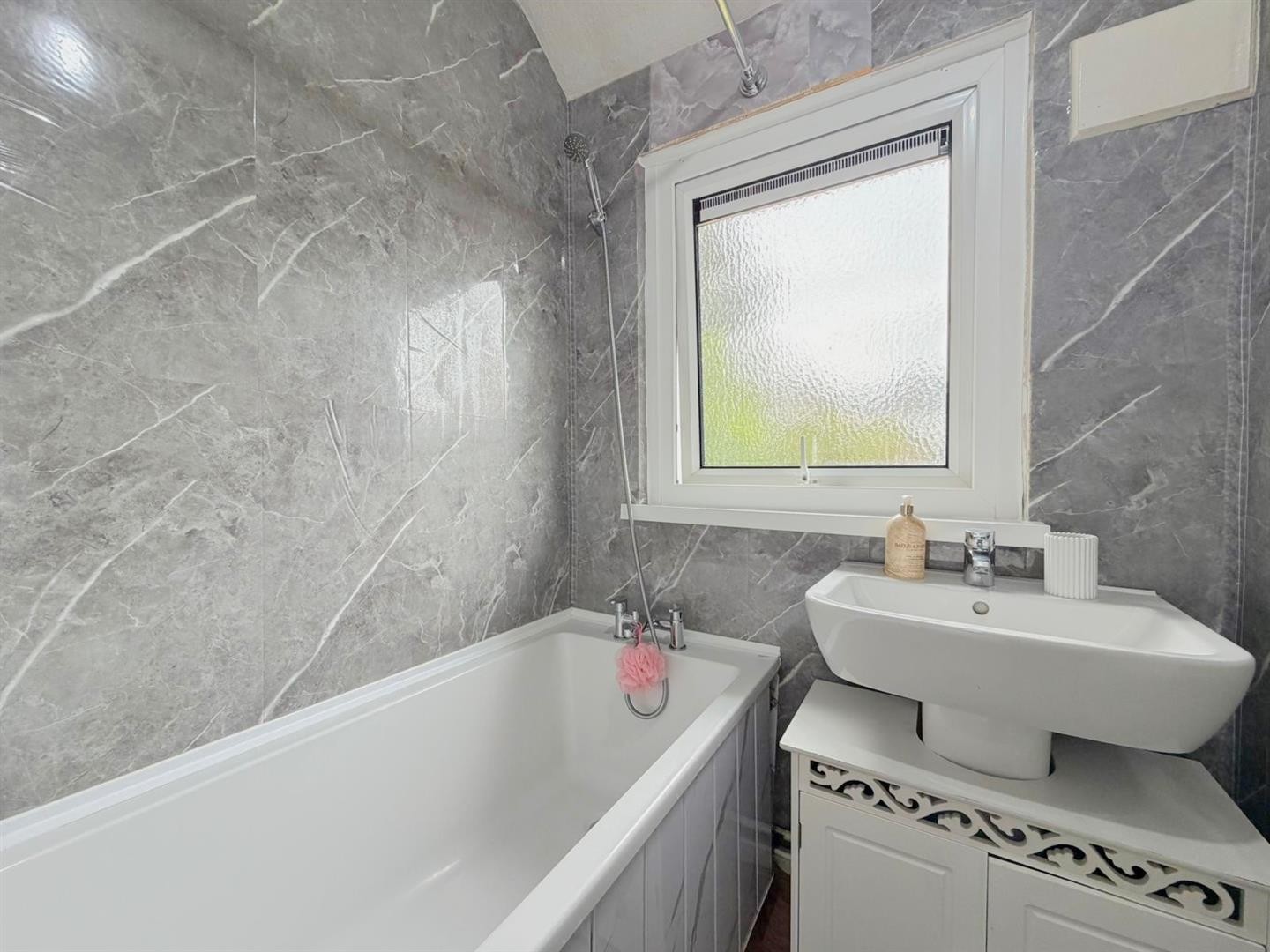 Wash hand basin with mixer tap and vanity units, bathtub with mixer tap and shower overhead, lino flooring, tiled walls, radiator, uPVC double glazed window