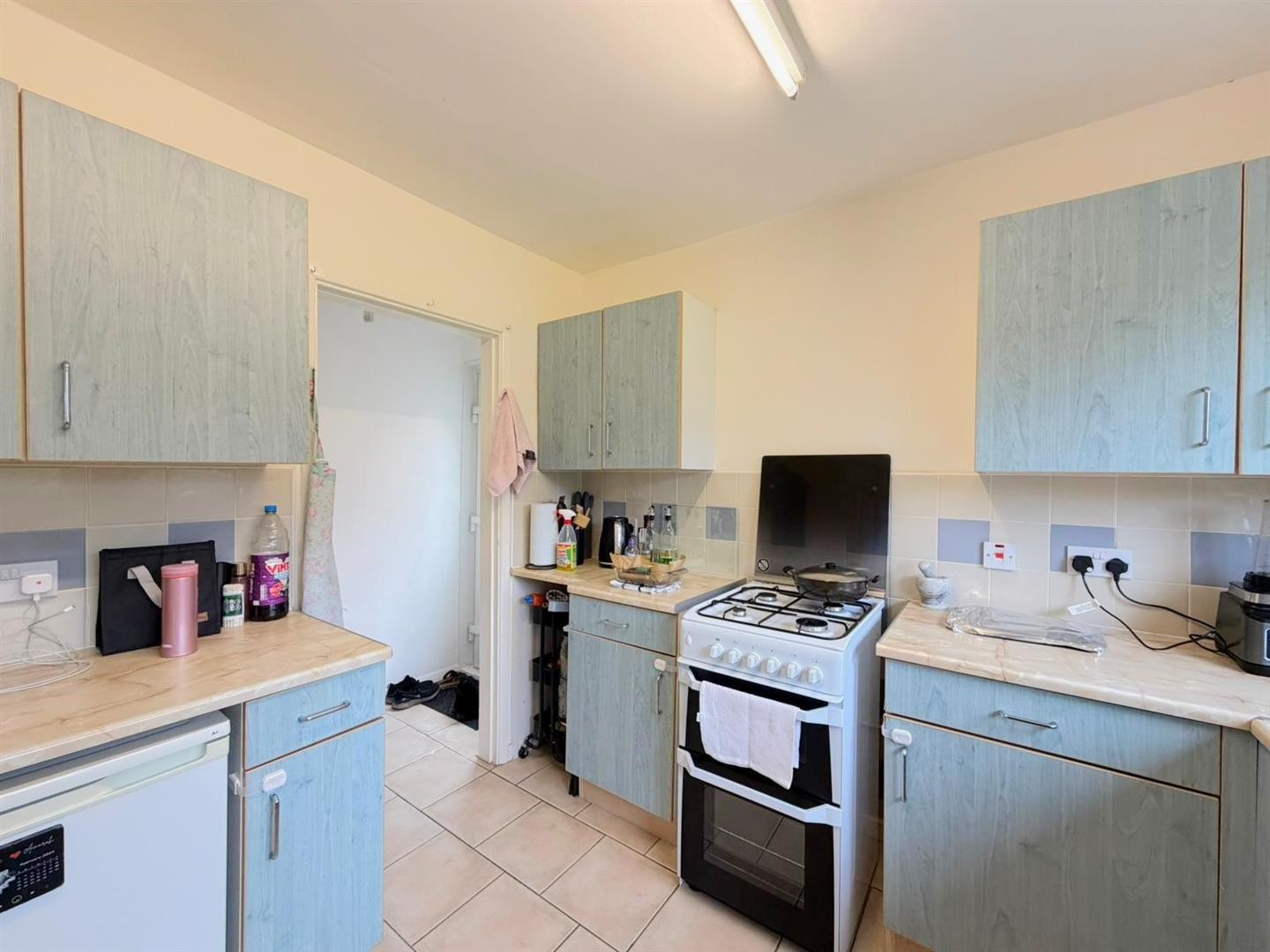 Wall and base units with worktops over, freestanding cooker / oven, sink with mixer tap and drainer, space for undercounter fridge / freezer, tiled flooring, partly tiled walls, uPVC double glazed window