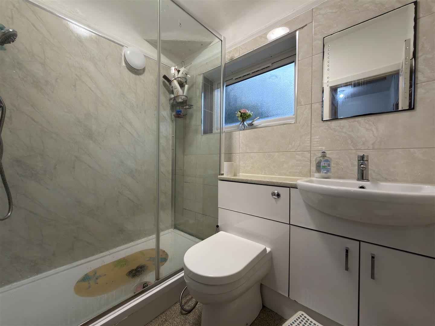 Vinyl flooring, tiled walls, wash hand basin with vanity unit, toilet, double glazed window facing the rear aspect, standing shower cubicle with panelled walls and mixer function, and standing radiator.