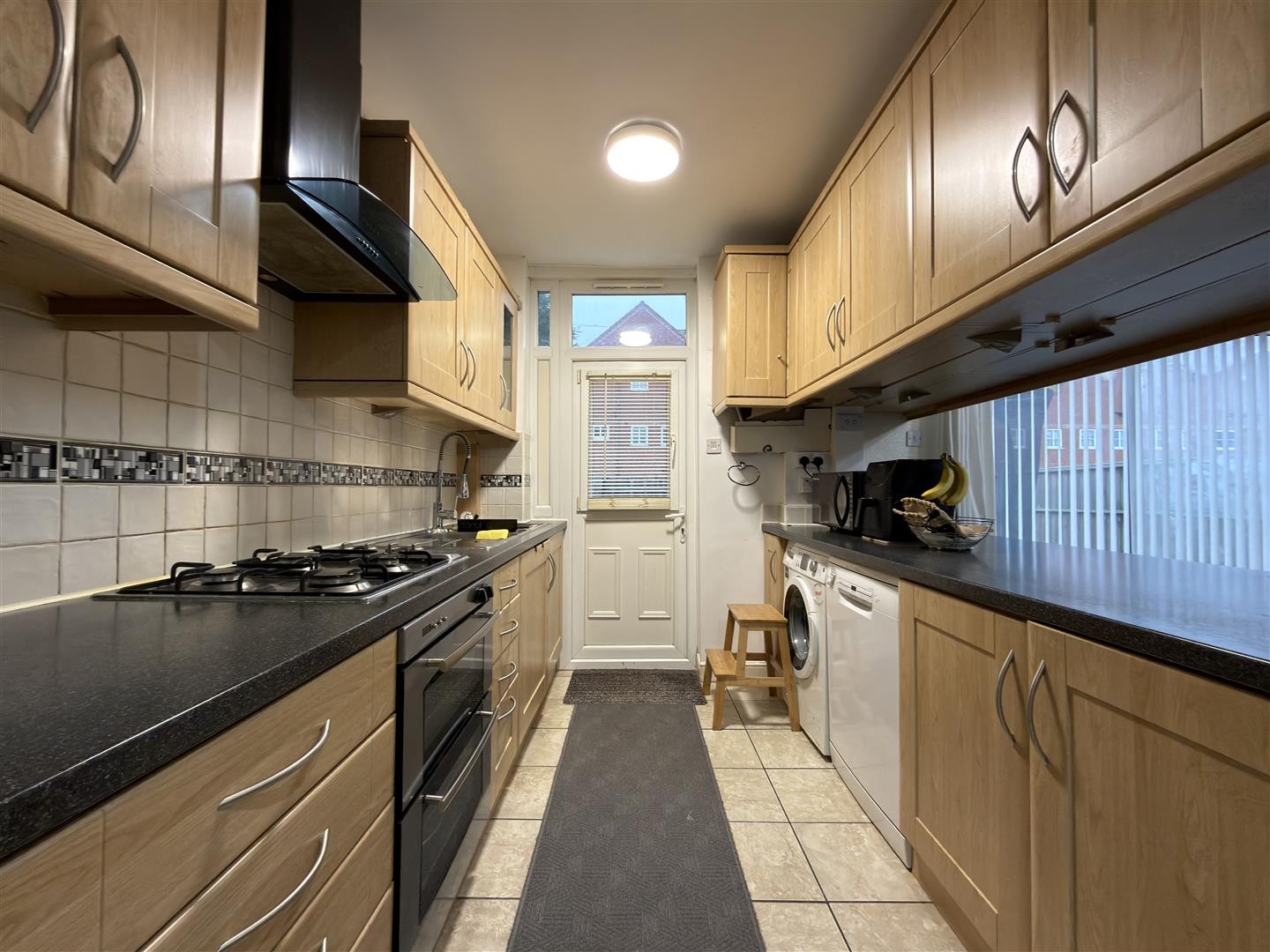 Tiled flooring, partially tiled walls, base and high-level units, integrated gas burner with integrated oven and extractor, dual stainless steel sink, plumbing and space available for a dishwasher and washing machine, space for a fridge, double glazed UPVC door allowing access into the garden, and gas-powered combination boiler.