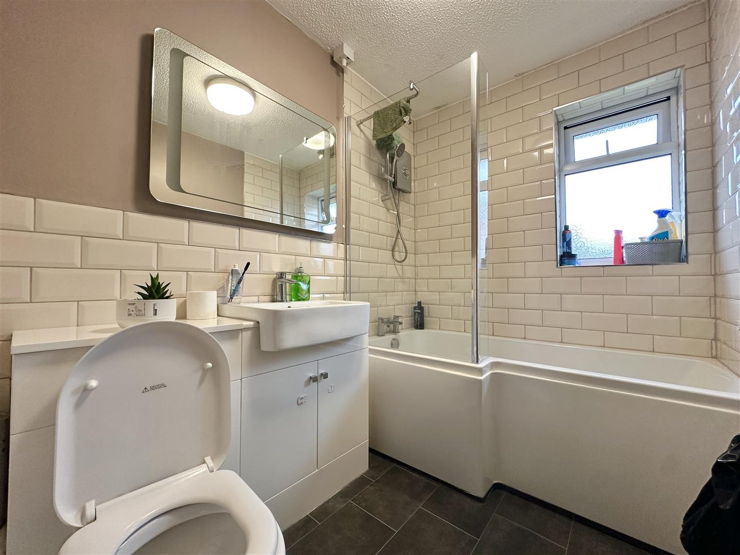Finished with vinyl flooring and partially tiled walls, comprising a toilet, wash hand basin, vinyl bathtub with electric shower function, standing radiator, and double glazed window facing the right aspect.