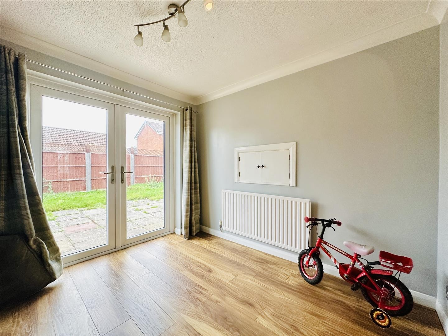 Finished with laminate flooring and fitted with a radiator. UPVC double doors provide access into the rear garden.
