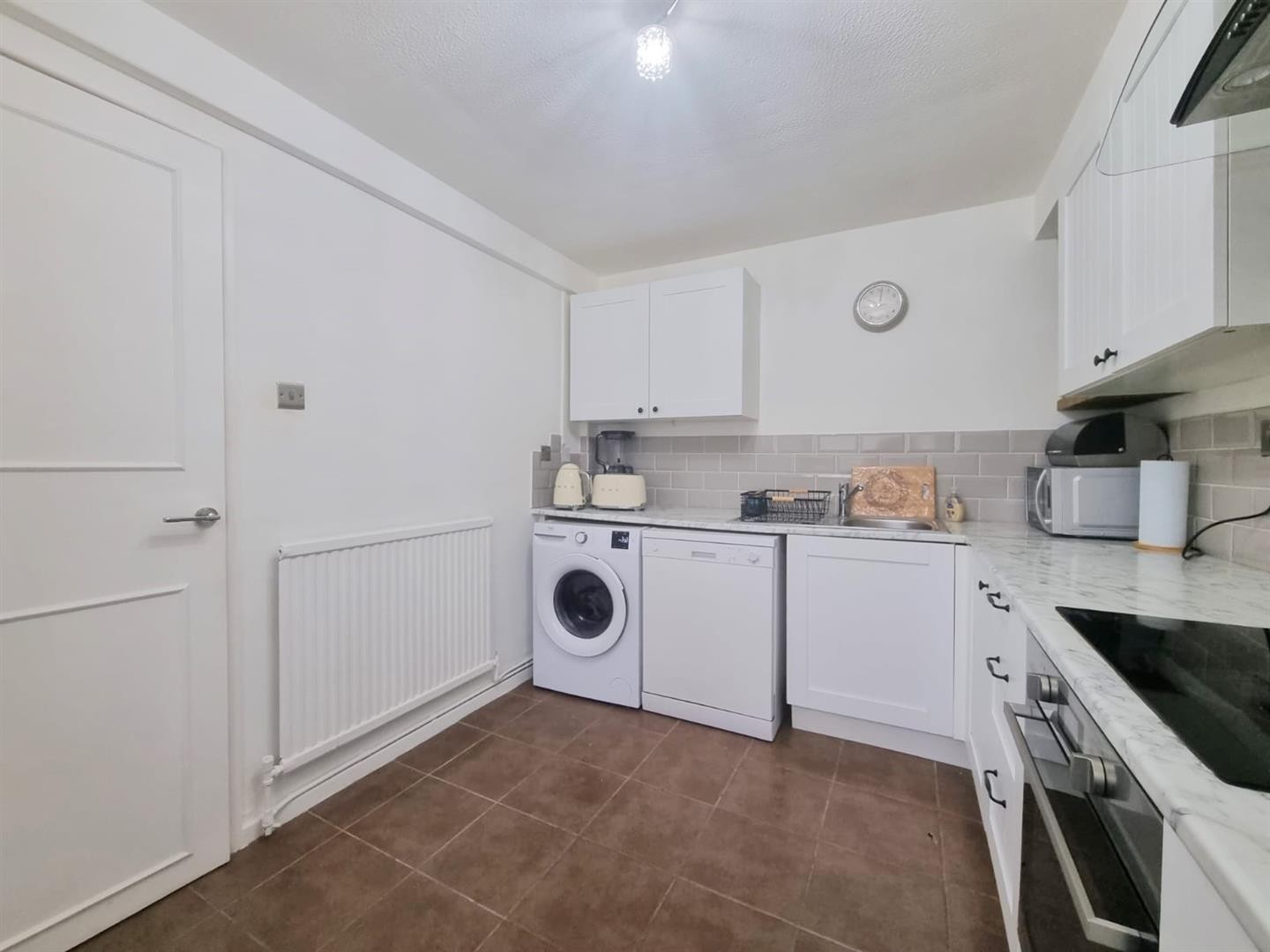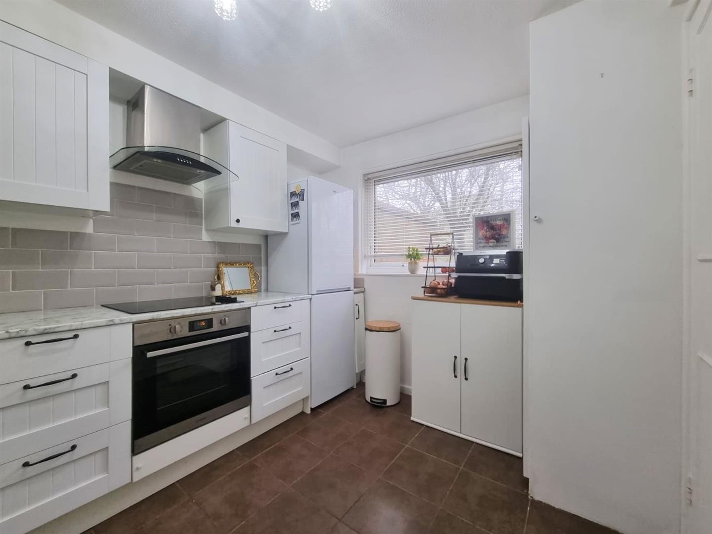 Wall and base units with worktops over, 4 ring electric hob with built-in oven and extractor hood, sink with mixer tap and drainer, space for fridge/freezer, plumbing for washing machine, radiator, tiled flooring, partly tiled walls, uPVC double glazed window