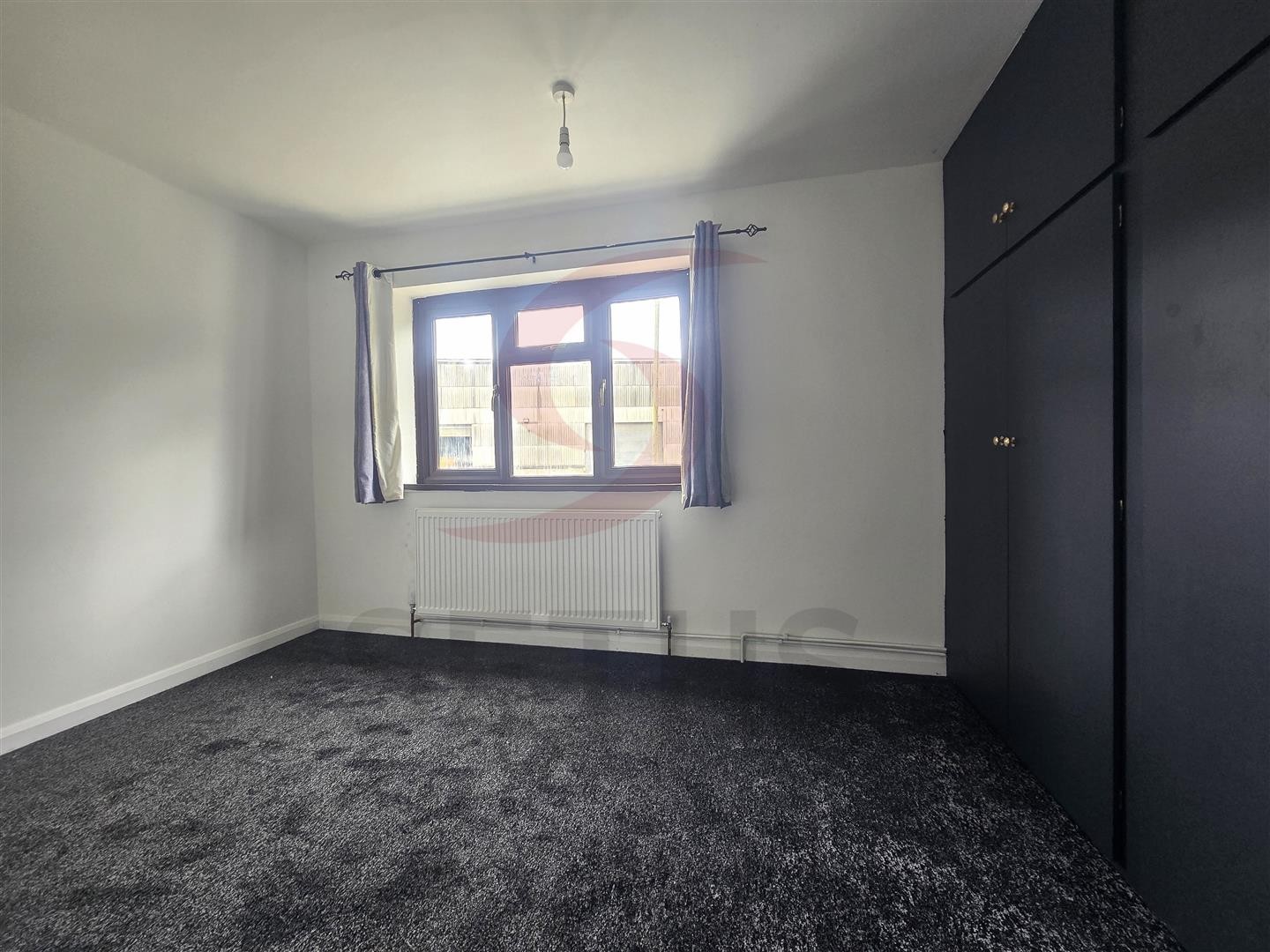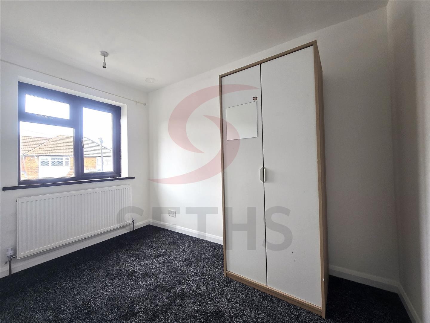 Rear-facing double bedroom with fitted storage, carpeted flooring, radiator, and PVCu double glazed window.