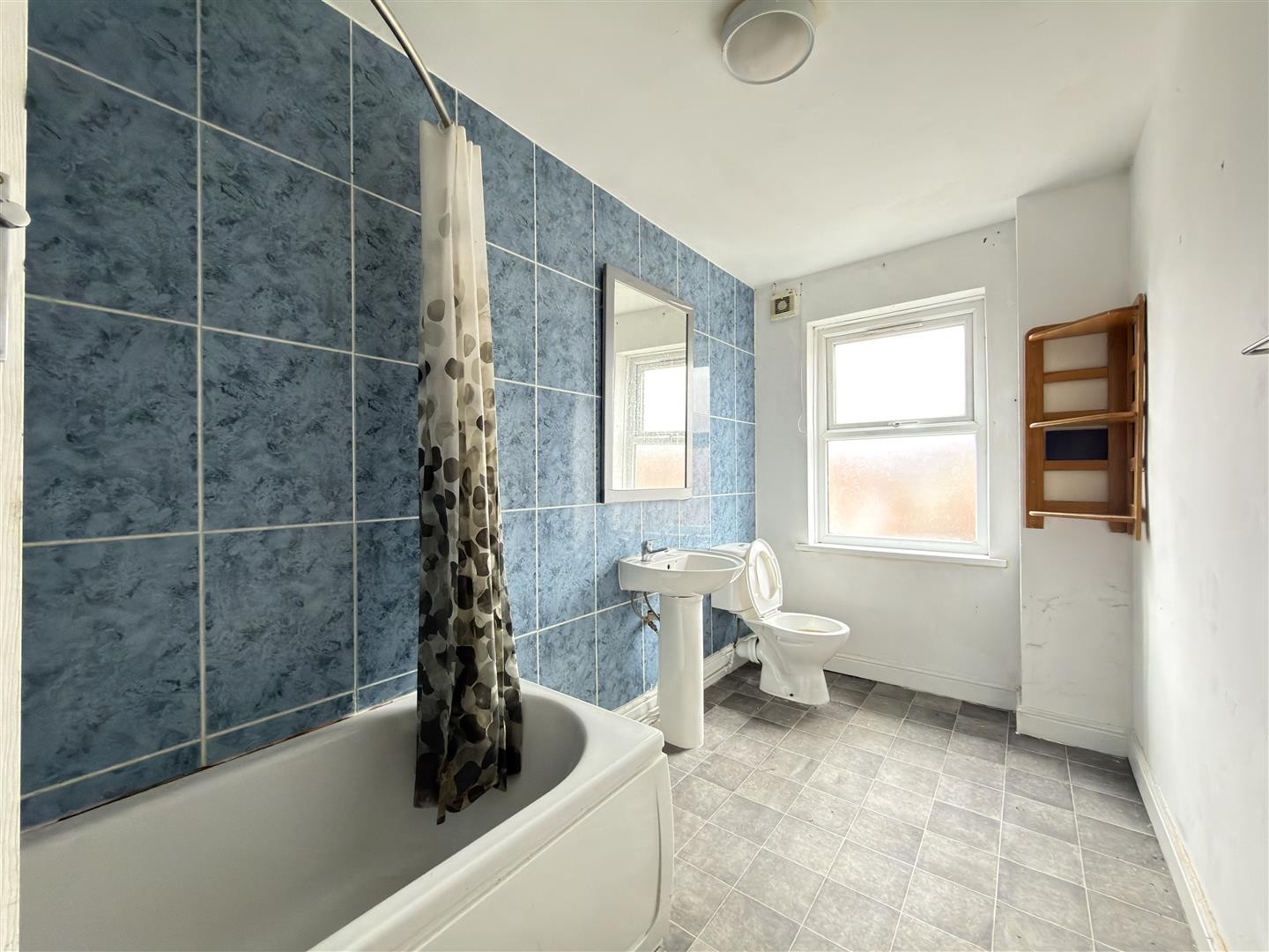 Vinyl flooring, radiator, polyvinyl bathtub with mixer attachment, partially tiled walls, wash hand basin, toilet, and double glazed window facing the rear aspect.