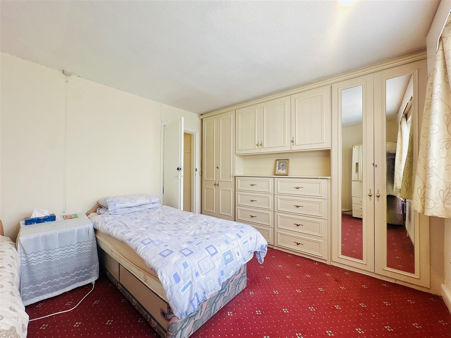 Carpeted flooring, radiator, double glazed window facing the front aspect, inbuilt storage cupboards.