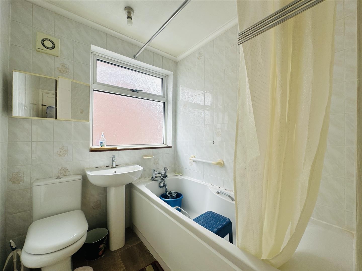 Vinyl flooring, tiled walls, toilet, wash hand basin, polyvinyl bathtub, double glazed window facing the side aspect.