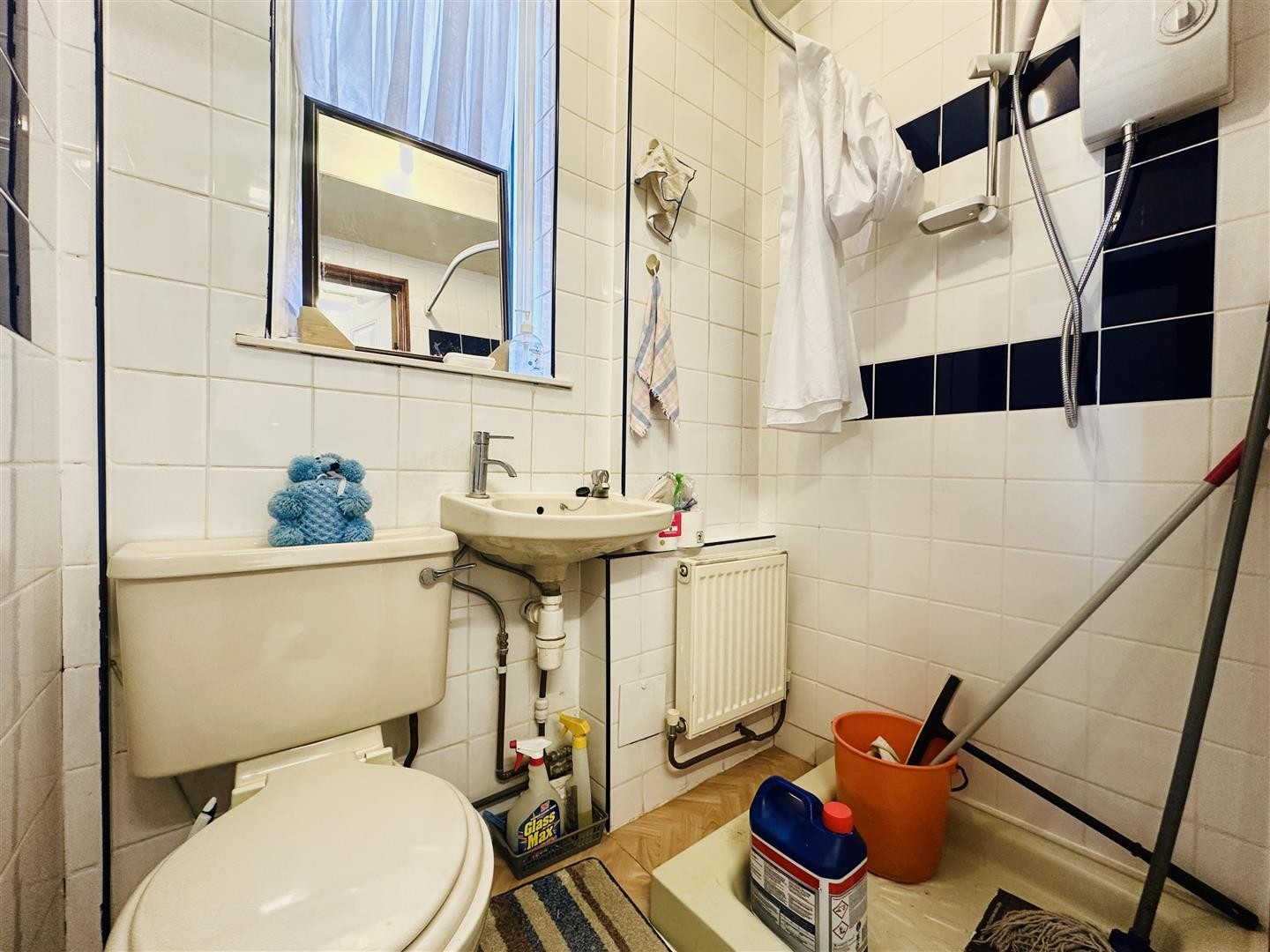 Vinyl flooring, tiled walls, toilet, wash hand basin, radiator, stand-up shower cubicle with electric shower, double glazed window facing the side aspect.