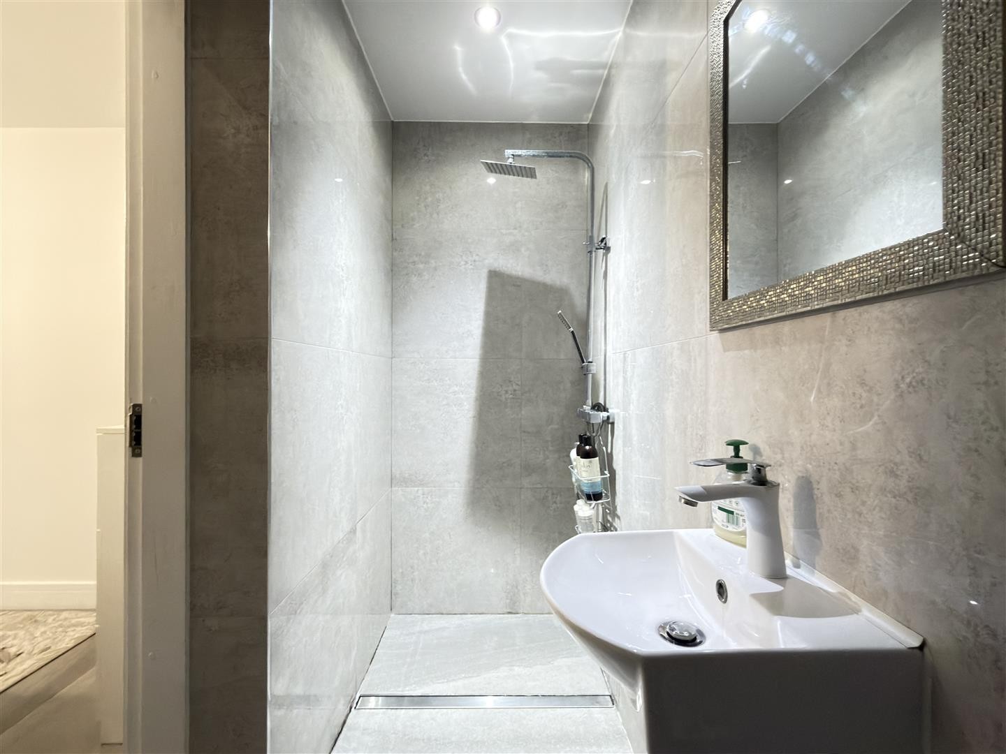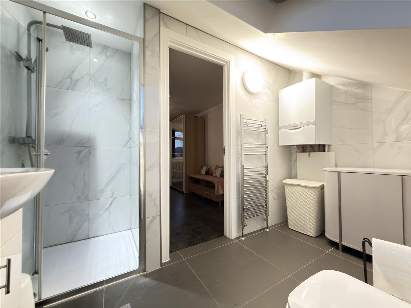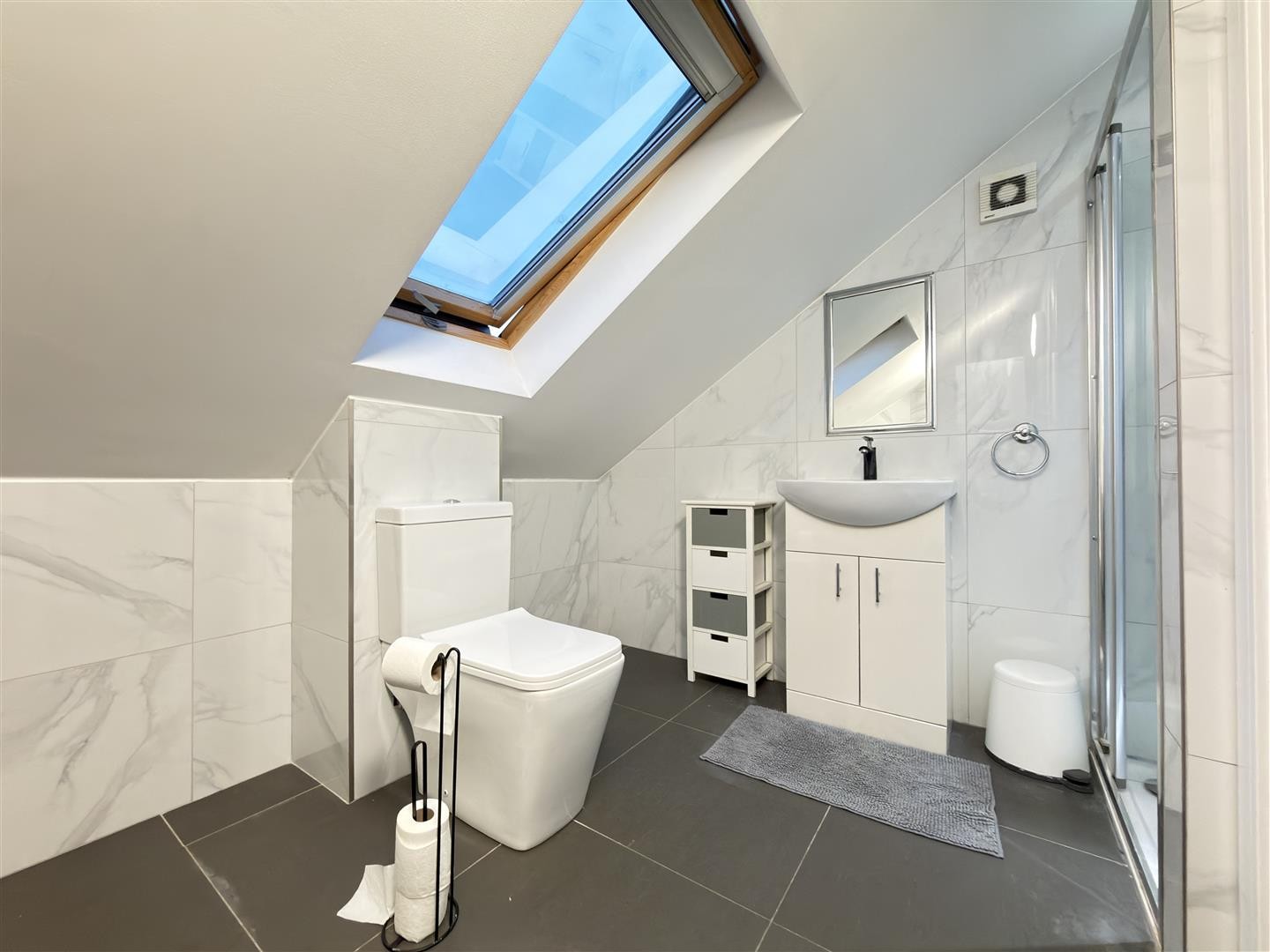 Finished with tiled flooring and tiled walls, featuring a stand-up radiator, toilet, wash hand basin with unit, shower cubicle with mixer function and rainfall head, and spotlighting. Houses the gas-powered combination boiler. A double-glazed Velux window faces the front aspect.
