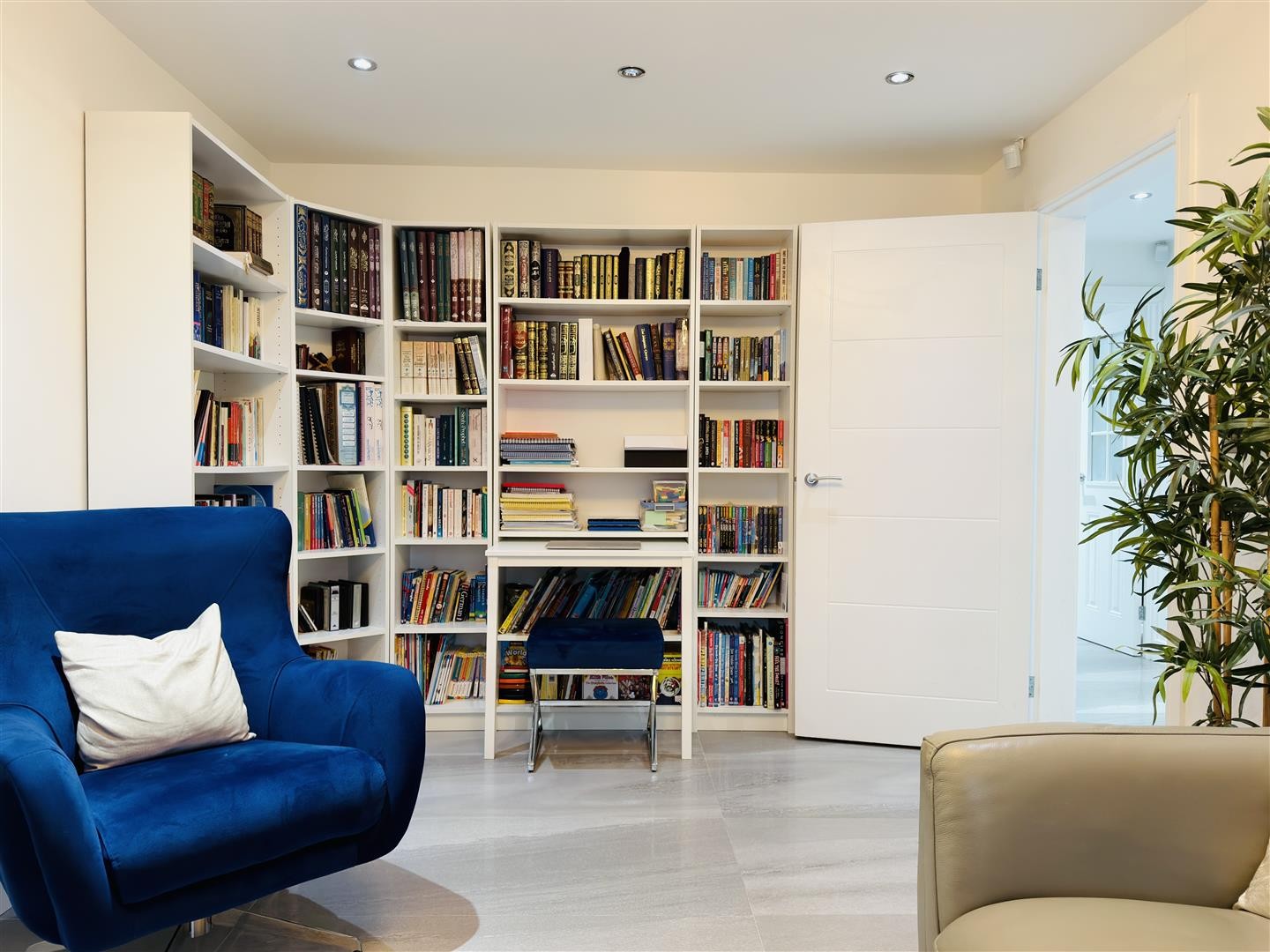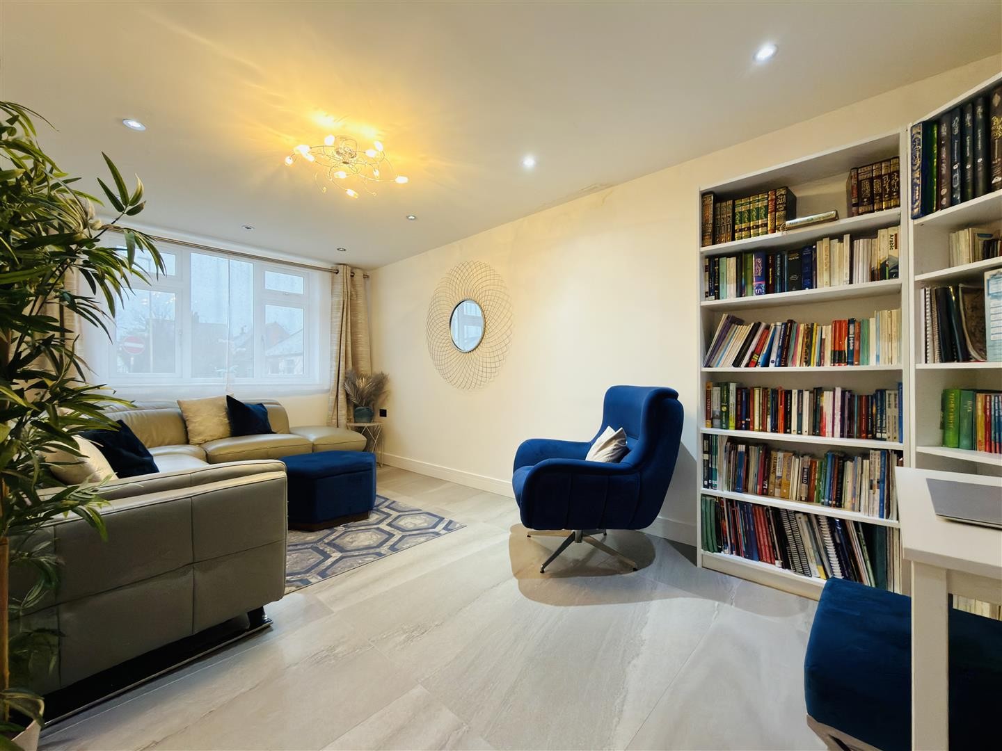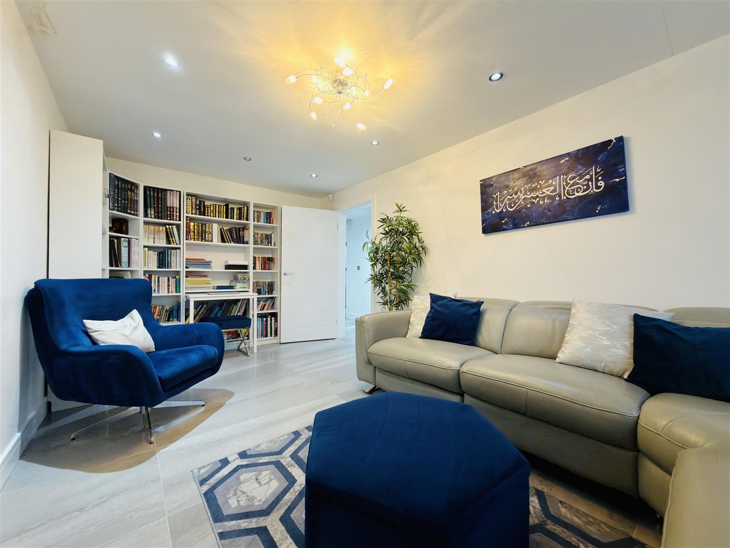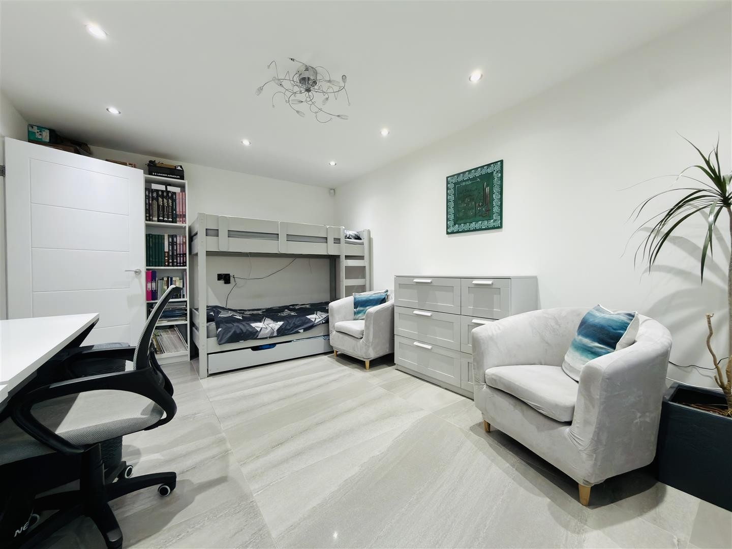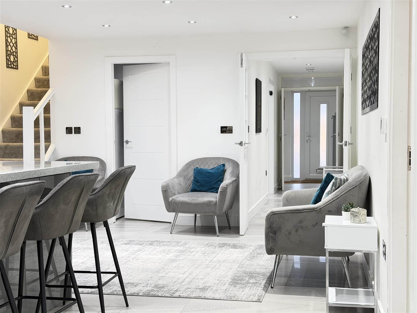 Finished with tiled flooring and heated via underfloor heating, with a control panel for the system. The entrance hall provides access to a downstairs reception room/bedroom, the lounge, and the family bathroom. Double doors open into the extended open-plan kitchen, living, and dining area. Spotlighting is fitted throughout.