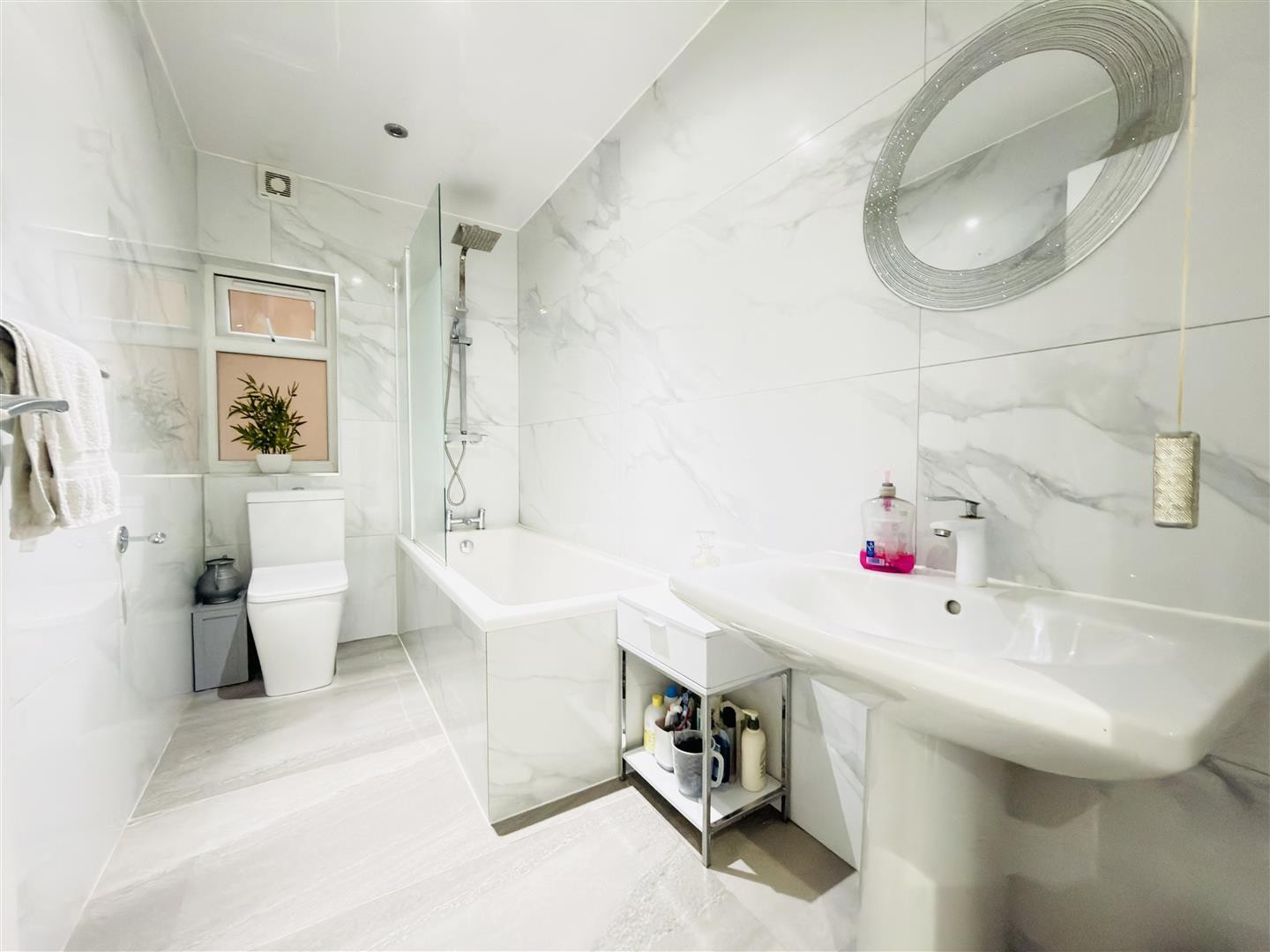 Comprising tiled flooring, tiled walls, and a panelled ceiling with spotlighting. Includes a wash hand basin, toilet, and polyvinyl bathtub with mixer attachment and rainfall function. A double-glazed window faces the side aspect.