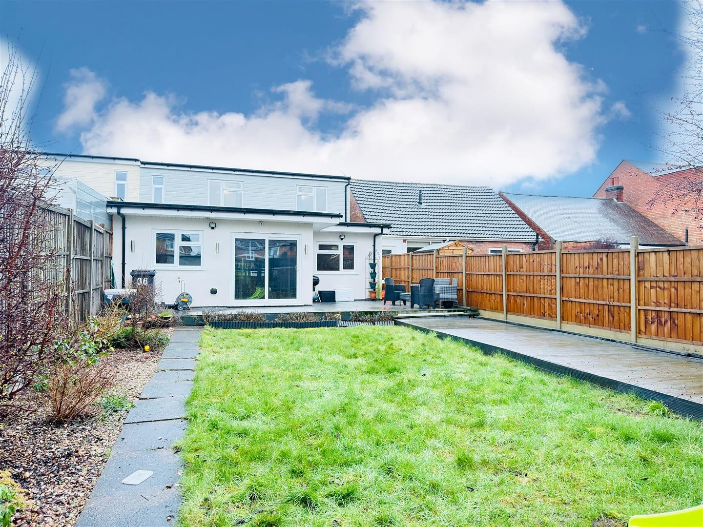 To the rear, the property benefits from an ample-sized garden featuring a wooden patio area leading onto a grass lawn with additional slabbed sections. The garden is secluded by a wooden fenced perimeter along the borders.