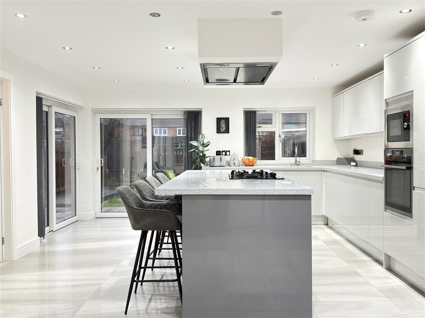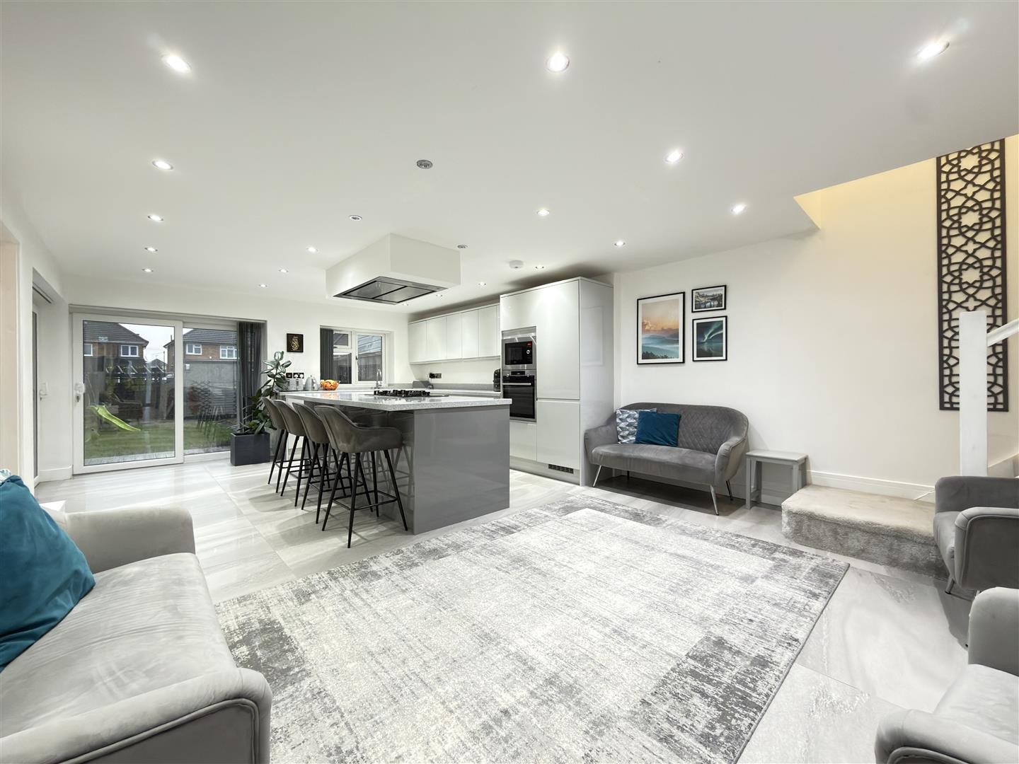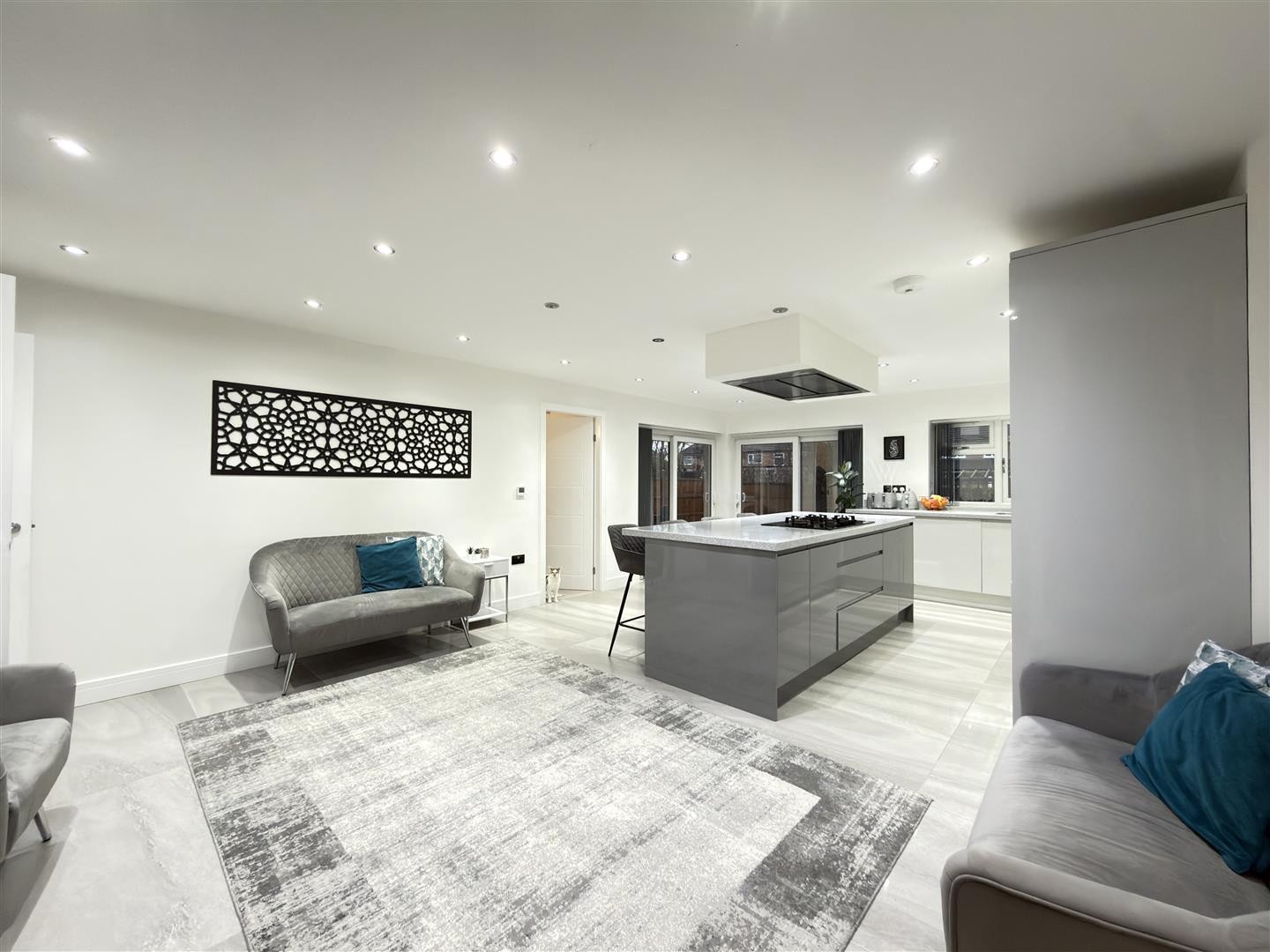 Finished with tiled flooring and underfloor heating, featuring spotlighting throughout. The space includes an integrated base-level island with worktop over and an integrated gas burner with extractor over. There is an integrated dishwasher, stainless steel sink, integrated microwave, integrated oven, integrated fridge, and integrated freezer. A double-glazed window faces the rear aspect. Sliding double-glazed UPVC doors to the rear and side provide access into the garden. Carpeted stairs rise to the first floor, and the area also provides access to the downstairs bedroom and utility room.