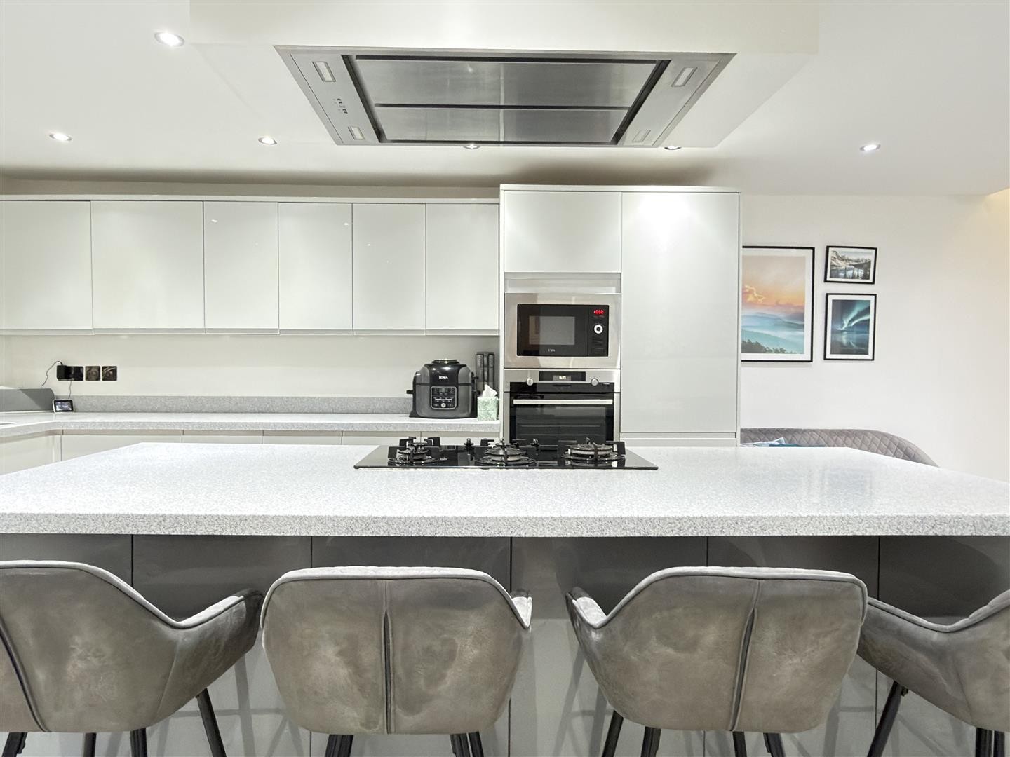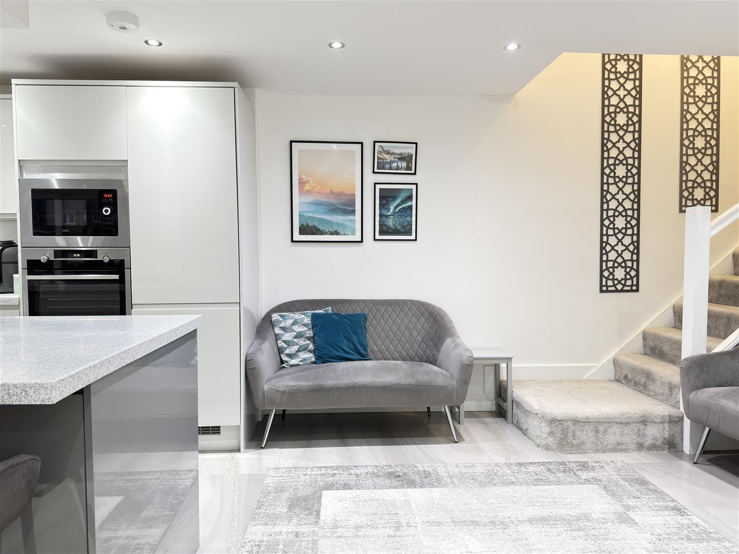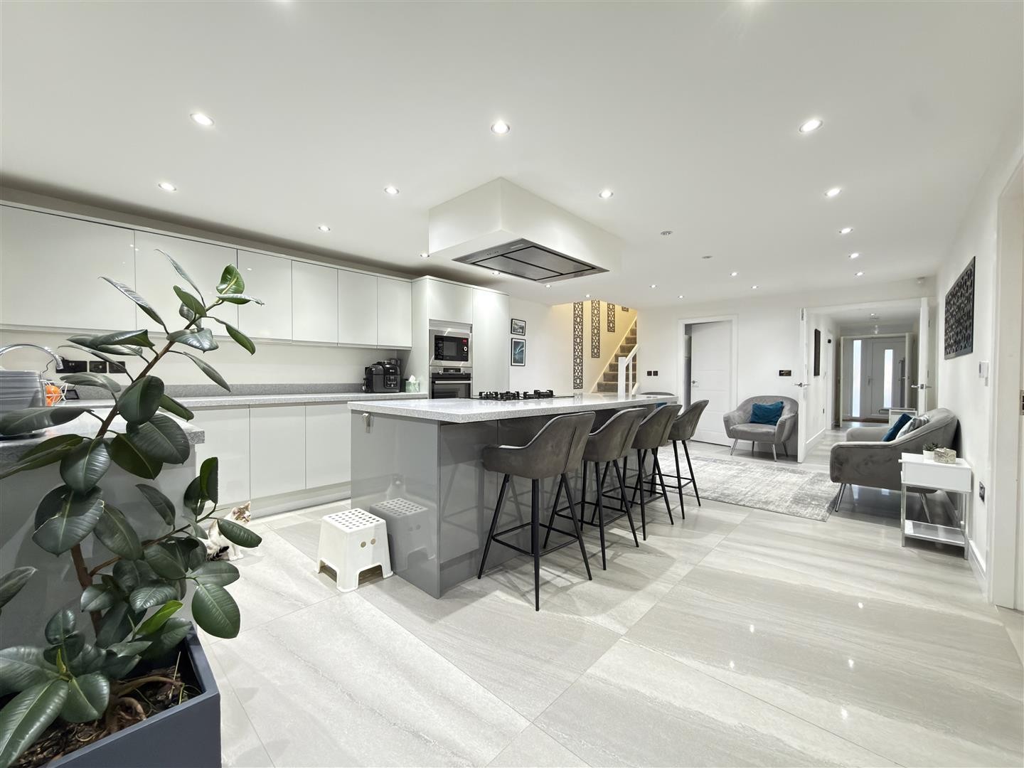 Finished with tiled flooring and underfloor heating, featuring spotlighting throughout. The space includes an integrated base-level island with worktop over and an integrated gas burner with extractor over. There is an integrated dishwasher, stainless steel sink, integrated microwave, integrated oven, integrated fridge, and integrated freezer. A double-glazed window faces the rear aspect. Sliding double-glazed UPVC doors to the rear and side provide access into the garden. Carpeted stairs rise to the first floor, and the area also provides access to the downstairs bedroom and utility room.