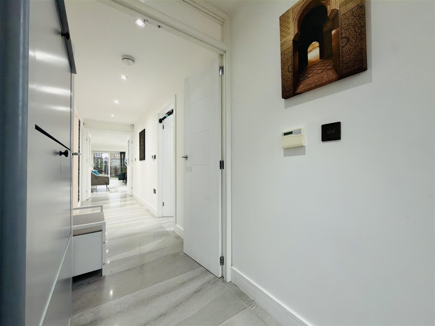 Accessed via a UPVC double-glazed door and finished with tiled flooring. The porch provides access to an alarm control panel and features spotlighting. Double doors open into the entrance hall.