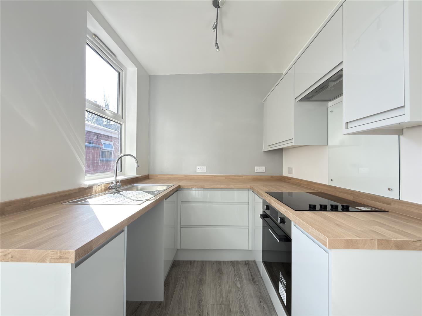 LVT flooring, base and eye-level units, double-glazed window to the side aspect, stainless steel sink, four-ring induction hob with oven and integrated extractor over. Space for washing machine. Radiator. Door providing access to the rear garden. storage cupboard accommodating gas powered combination boiler.