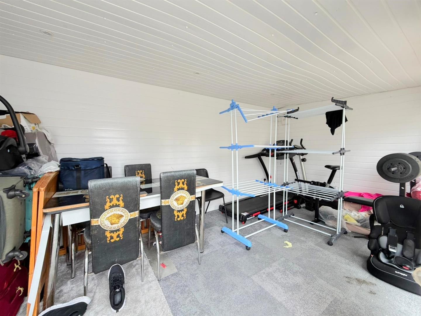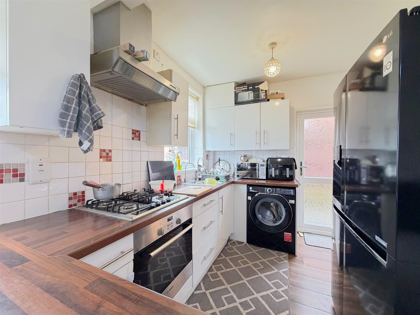 Wall and base units with worktops over, 4 ring gas hob with built-in oven and extractor hood, sink with mixer taps and drainer, space for fridge / freezer, plumbing for washing machine, partly laminate / partly carpeted flooring, partly tiled walls, radiator, x3 uPVC double glazed windows, x2 uPVC double glazed doors leading to garden.