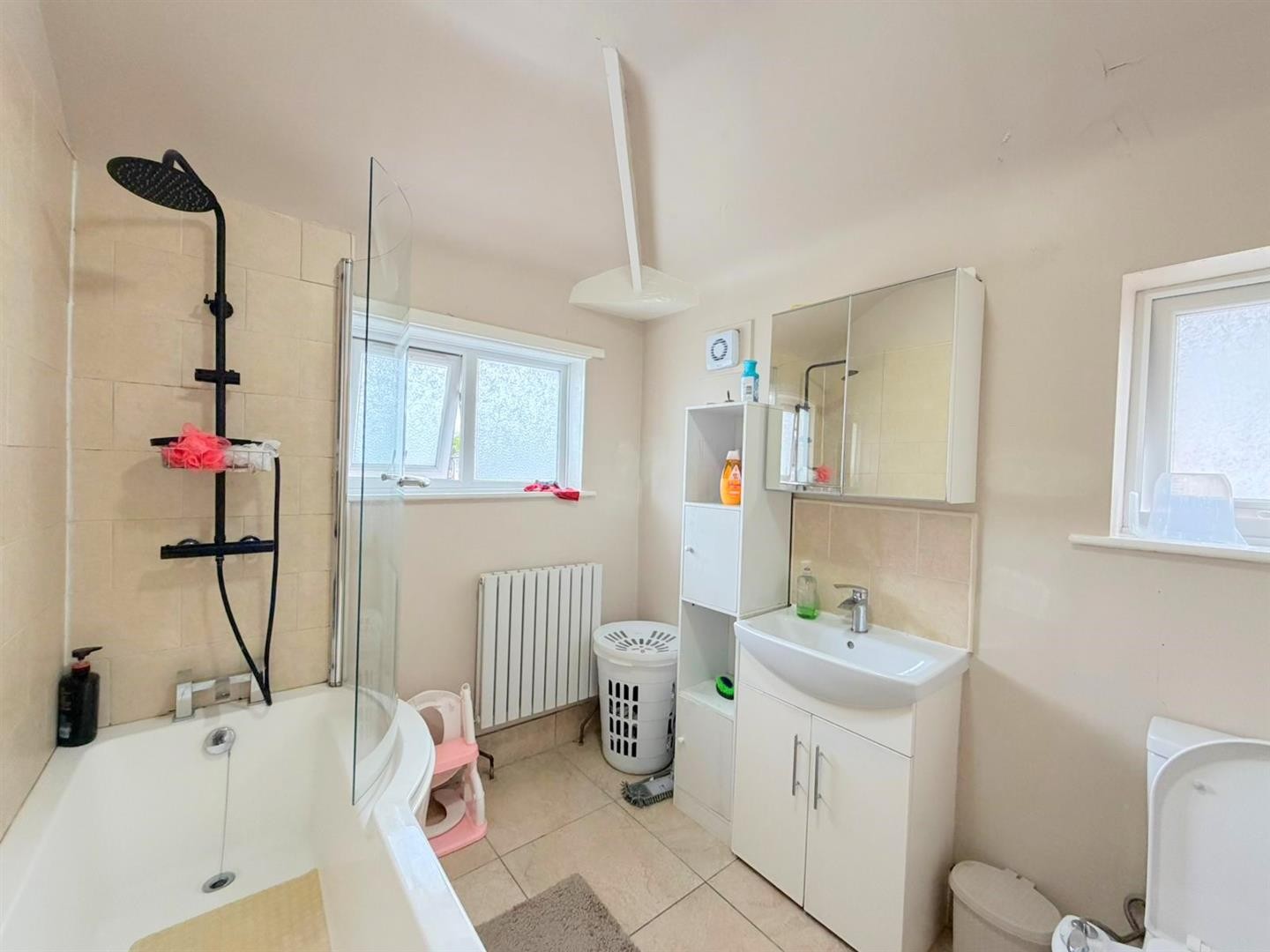 WC, wash hand basin with mixer tap and vanity units, bathtub with mixer tap and shower overhead, radiator, tiled flooring, partly tiled walls, x2 uPVC double glazed windows.
