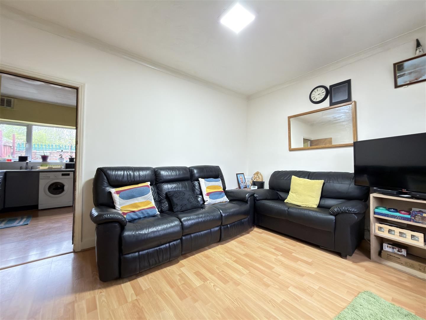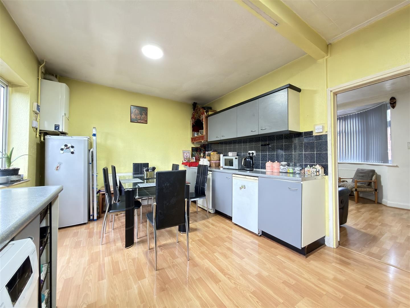 Laminate flooring, radiator, base and eye-level units, space for four-ring hob with gas supply and integrated extractor over, gas combination boiler, stainless steel sink, space and plumbing for washing machine, space for fridge, dining area, storage cupboard beneath the stairs housing the meters and consumer unit. Door providing access to the rear garden.