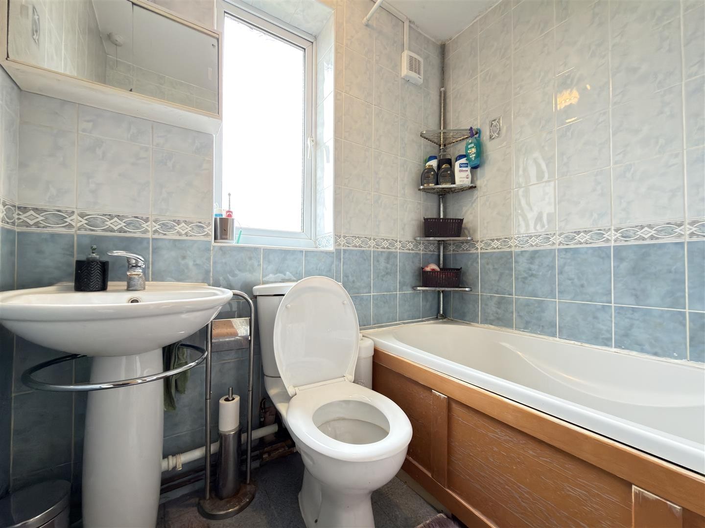 Vinyl flooring, tiled walls, radiator, panelled bath with electric shower over, wash hand basin, WC, double-glazed window to the rear aspect.