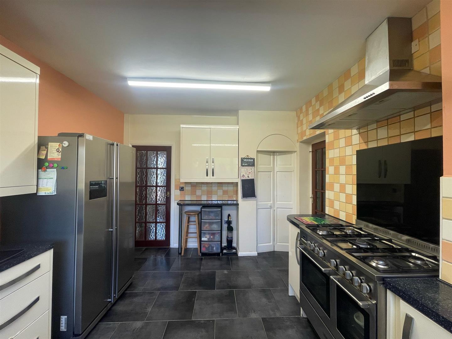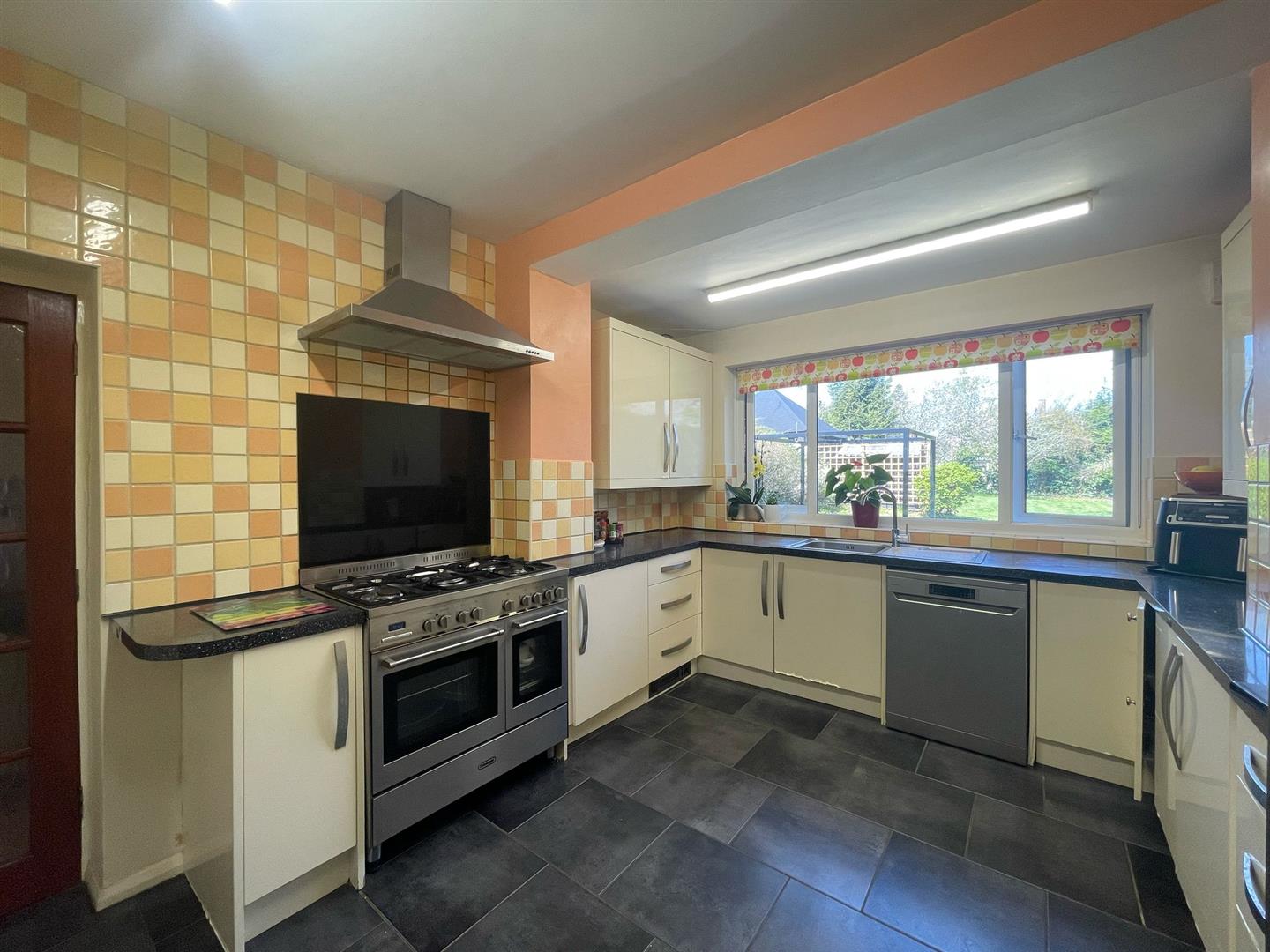 Wall and base units with worktops over, sink with mixer tap and drainer, space for Rangemaster cooker, extractor hood, plumbing for dishwasher, space for American fridge/freezer, breakfast bar, radiator, tiled flooring, partly tiled walls, extractor fan, uPVC double glazed window