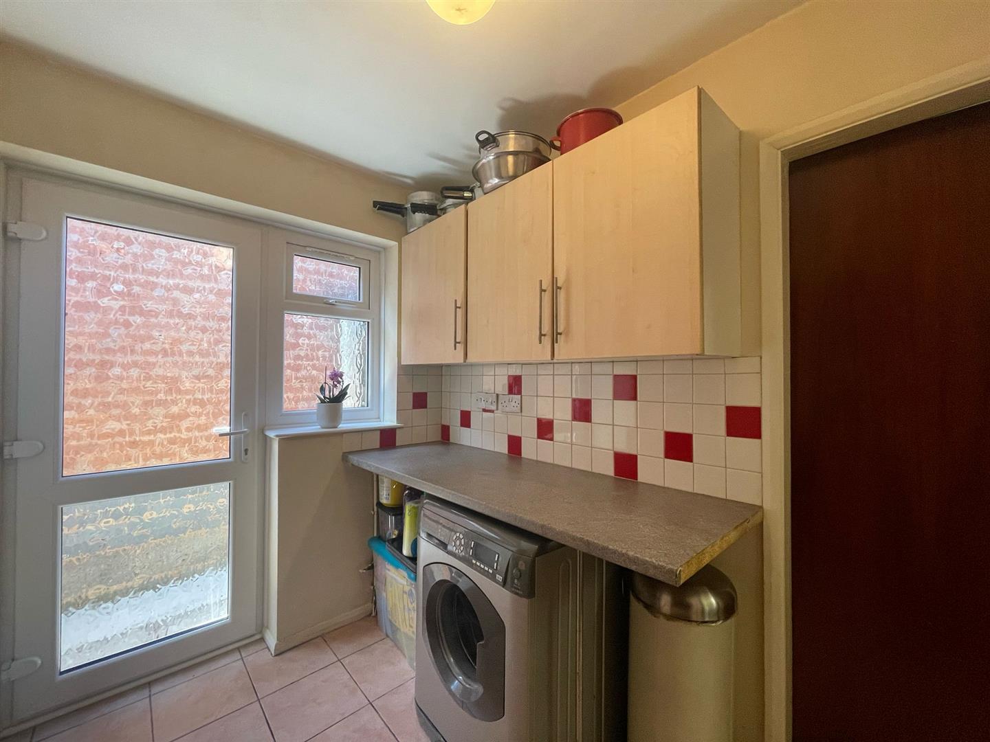 Wall mounted units, worktop space, plumbing for washing machine, tiled flooring, partly tiled walls, radiator, uPVC double glazed window, uPVC double glazed door, access to garage / WC