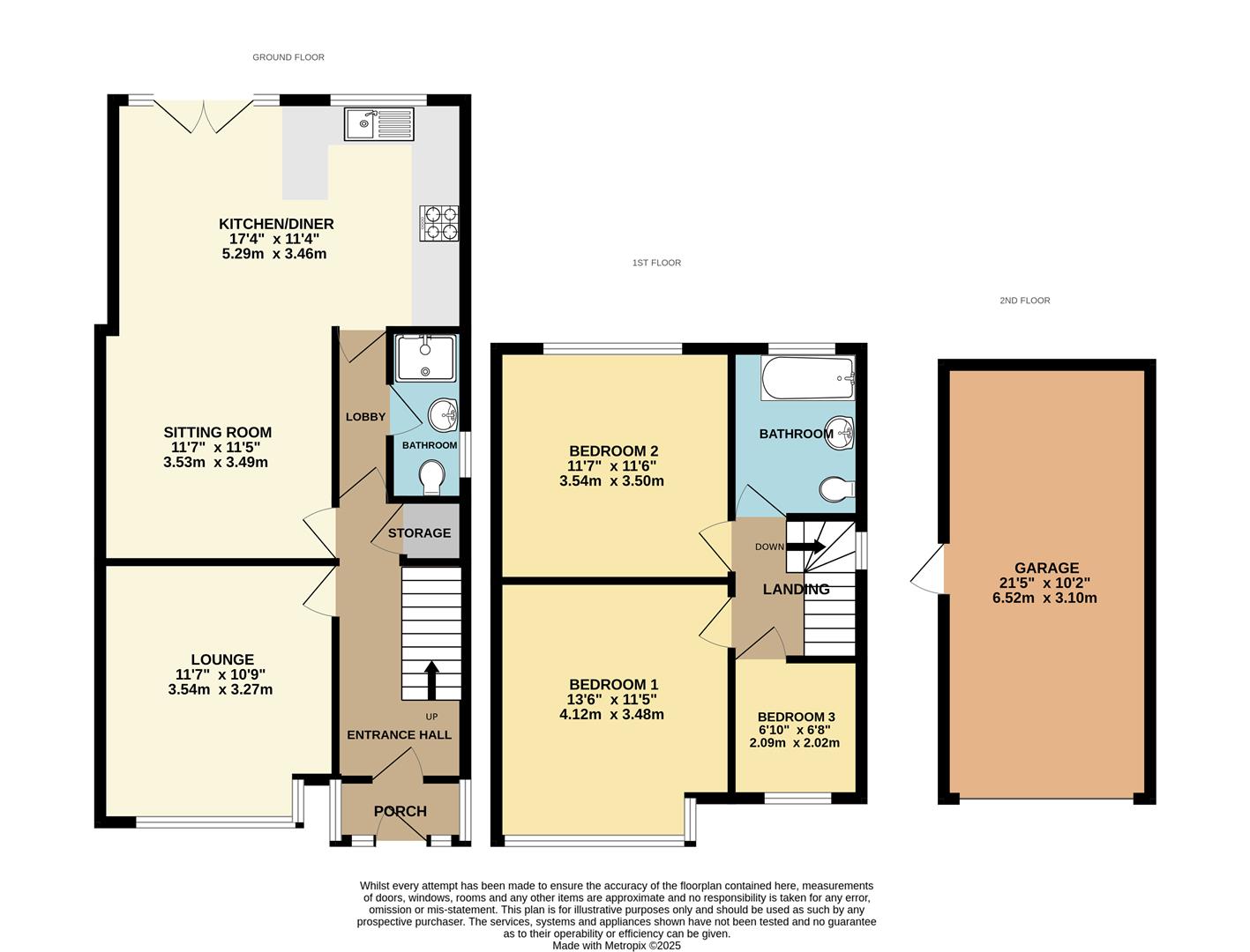 Ample-sized garage with concrete flooring, power supply, and additional loft storage. Features a metal up-and-over door for vehicle access and a side entrance door leading to the garden. A double-glazed window faces the side aspect.